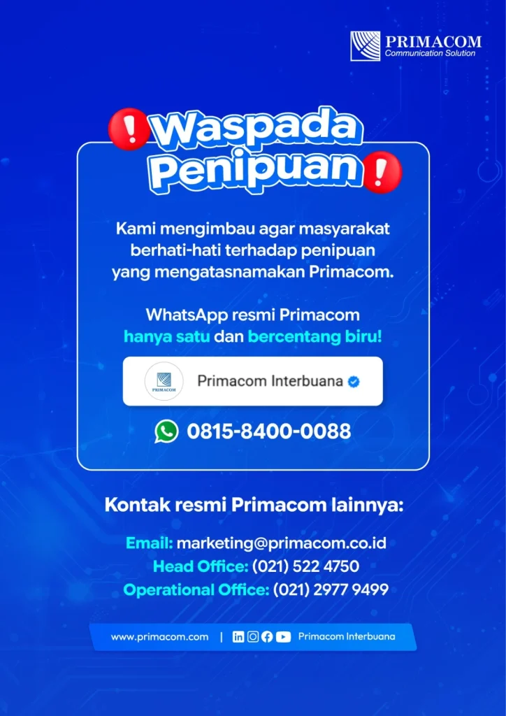 Primacom tidak pernah meminta pelanggan untuk melakukan pembayaran ke rekening pribadi ataupun meminta kode OTP, password, dan informasi rahasia lainnya. Sebelum melakukan transaksi apa pun, pastikan Anda telah memverifikasi informasi melalui nomor dan email resmi Primacom yang tercantum di atas. Langkah sederhana ini dapat mencegah kerugian yang lebih besar.